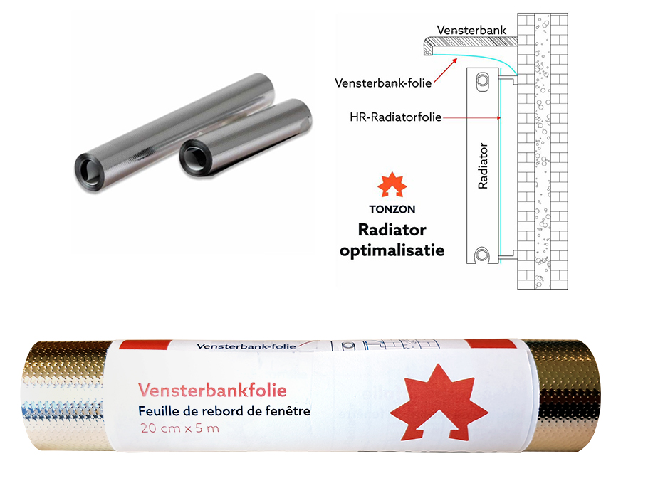Wist je dat er een hoop warmte verloren gaat via de muren achter radiatoren? Zonde! Bespaar deze warmte door (naast radiatorfolie) vensterbankfolie van Tonzon aan te brengen aan de onderkant van de vensterbank. Dit zorgt ervoor dat de warmte afgifte naar de ruimte verbeterd wordt. De vensterbankfolie bevestig je als een soort spoiler boven de radiator waardoor de warmte beter de kamer ingeleid wordt.
